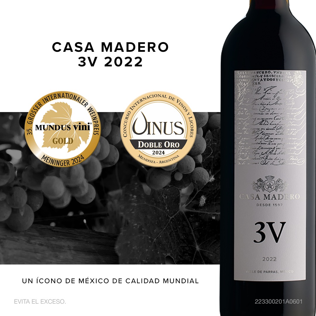 Este 2024, 3V de Casa Madero ha dejado huella con dos grandes reconocimientos: una Doble Medalla de Oro en el prestigioso concurso Vinus en Argentina y una Medalla de Oro en el destacado concurso Mundus Vini en Alemania. Estos logros no solo elevan el nombre de Casa Madero, sino que posicionan a México como un país que comienza a ser un referente en el mundo de la viticultura.