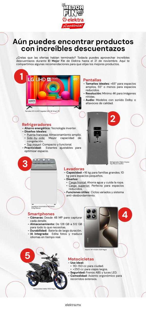 ¿Creías que las ofertas habían terminado? Todavía puedes aprovechar increíbles descuentazos durante El Mejor Fin de Elektra hasta el 21 de noviembre. Aquí te compartimos algunas recomendaciones para que elijas los mejores productos.