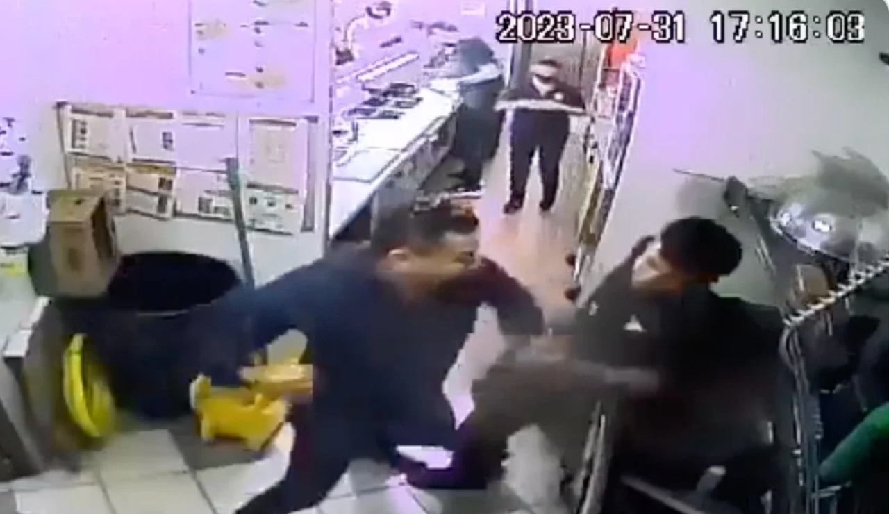 En redes sociales denunciaron la agresión de un sujeto hacia un joven en el interior de una cocina de un restaurante de comida rápida en San Luis Potosí.