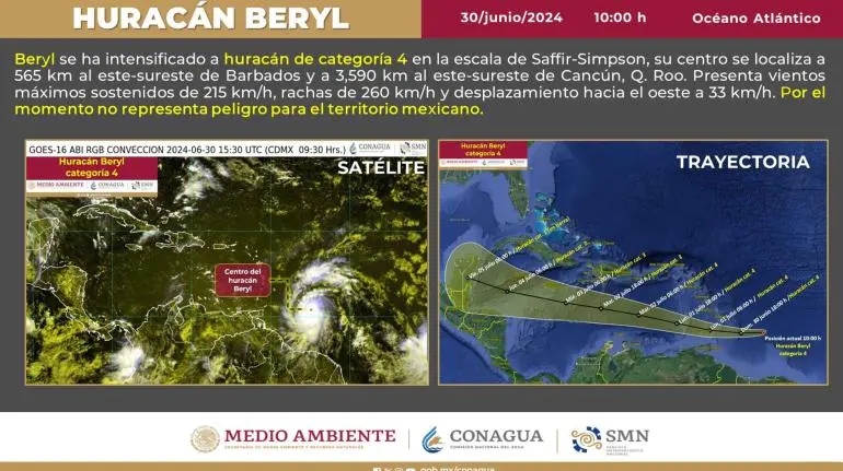 El organismo indicó que “Beryl” se localiza a 3 mil 780 km al este-sureste de Cancún, Quintana Roo y resaltó que por el momento no representa peligro para el territorio mexicano.