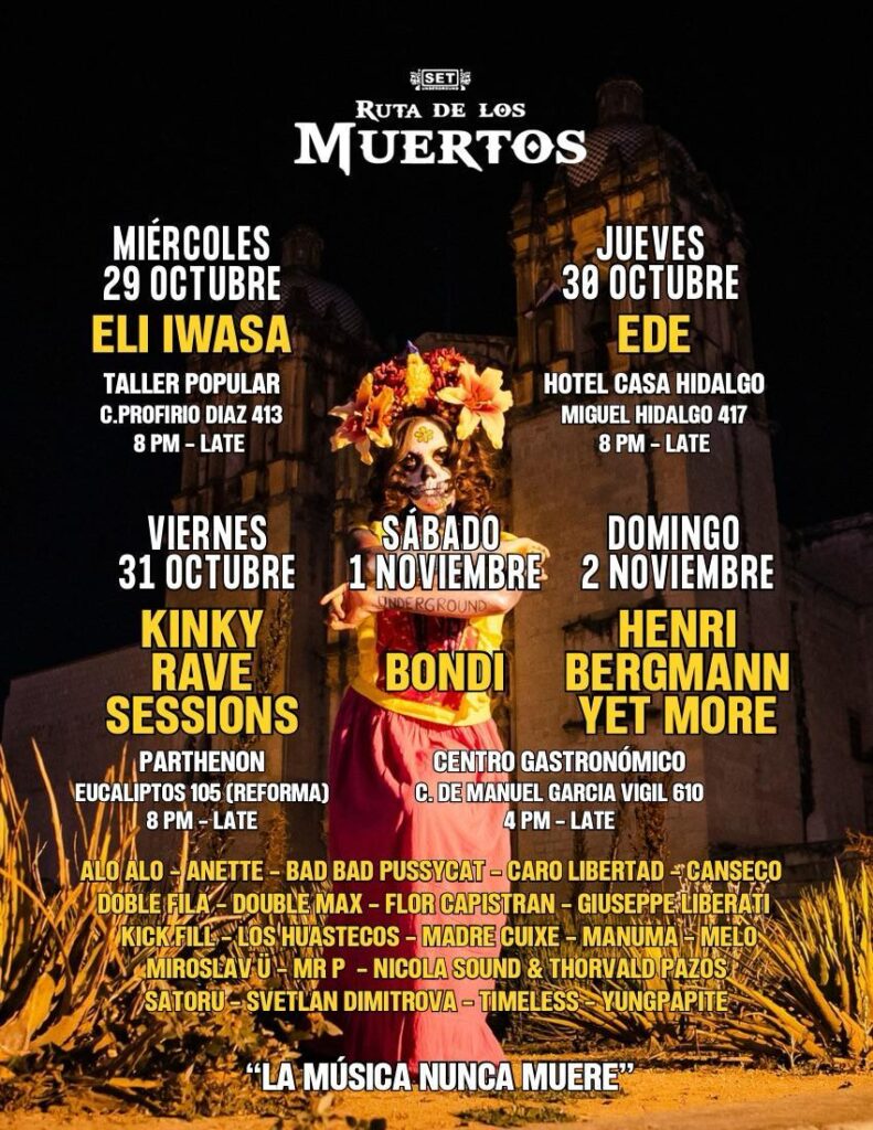 Desde su fundación, Set Underground se ha caracterizado por transformar los espacios en templos efímeros de libertad, donde la música se convierte en una forma de comunión colectiva. Esta vez, la magia se extenderá durante cuatro días con una programación que hará vibrar distintos rincones de la ciudad. El jueves 30 de octubre, el Hotel Casa Hidalgo abrirá las puertas con una velada inmersiva; el viernes 31, el Parthenon recibirá el pulso hipnótico de Kinky Rave Sessions; el sábado 1 de noviembre, el reconocido Bondi será el centro de una noche de euforia; y finalmente, el domingo 2 de noviembre, el Centro Gastronómico de Oaxaca se convertirá en un altar sónico con las presentaciones estelares de Henri Bergman y Yet More, quienes traerán desde Europa un viaje de atmósferas melódicas y poderosos crescendos techno que se fundirán con la energía local.